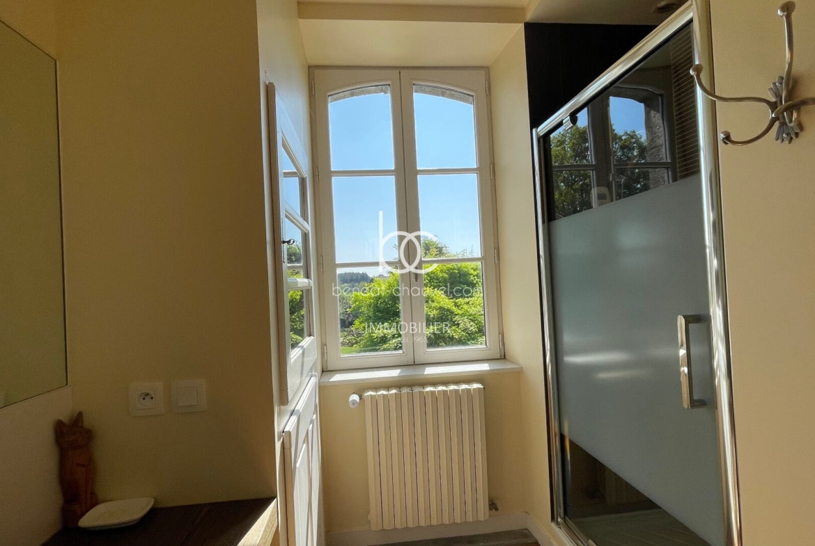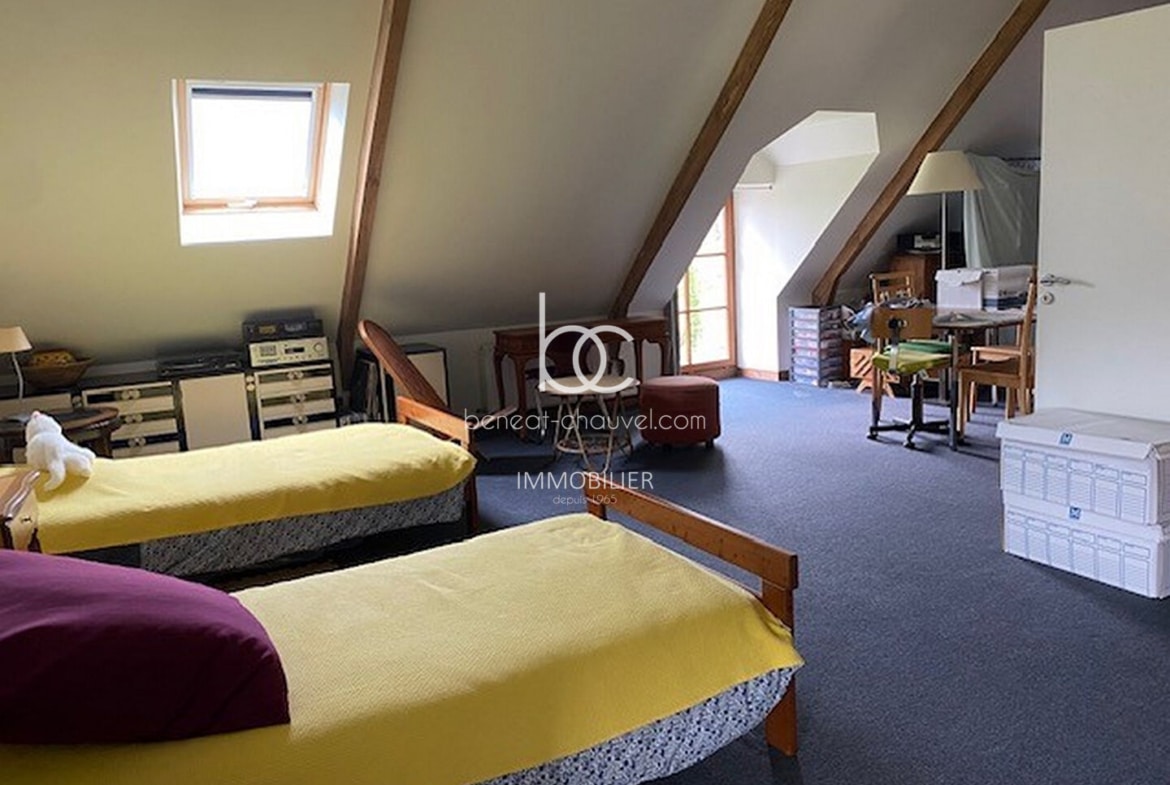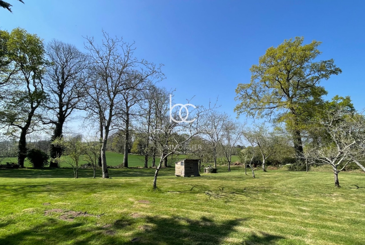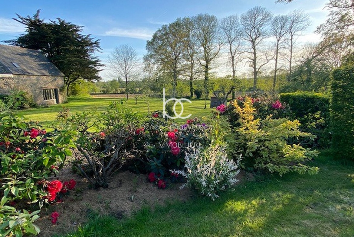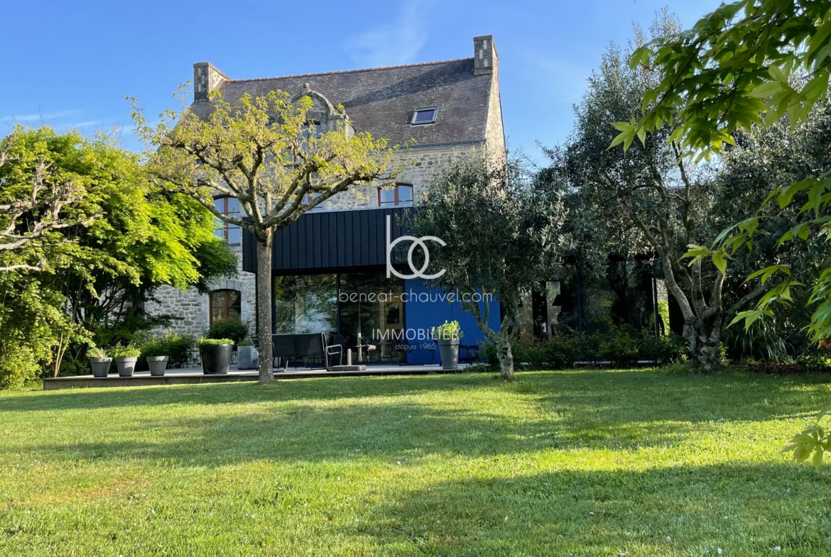 Campagne de Plescop, 10 minutes de Vannes, Magnifique propriété de caractère comprenant : Hall, séjour-salon avec poêle à bois, bureau, cuisine équipée, salle à manger, une très belle chambre avec salle de bains (baignoire et douche), wc. Etage : 4 belles chambres dont une avec salle d’eau et wc, salle d’eau, wc. Combles : Très belle mansarde aménagée (salle de sport, chambre…). Sous-sol : Cave, chaufferie, buanderie cellier, atelier.