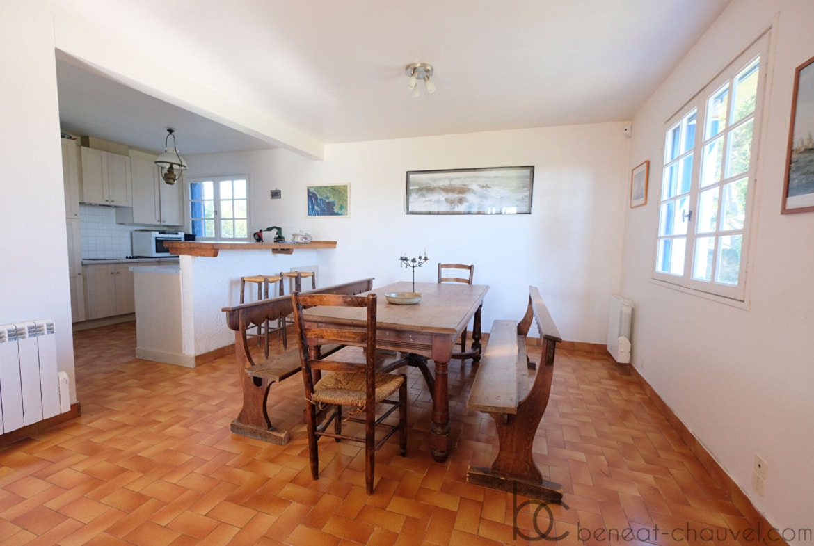 La maison principale est lumineuse et fonctionnelle. Le rez-de-chaussée comprend une entrée, un séjour/salon exposé plein sud et réchauffé par une cheminée, ainsi qu’une cuisine ouverte équipée. Pour un confort de plain-pied, on trouve une chambre, une salle de bains et un WC indépendant, complétés par un garage. L’étage est entièrement dédié à la vue mer : il dessert trois chambres spacieuses, toutes avec une vue imprenable sur la mer. On y trouve également une salle de douche avec WC et un espace mezzanine lumineux.